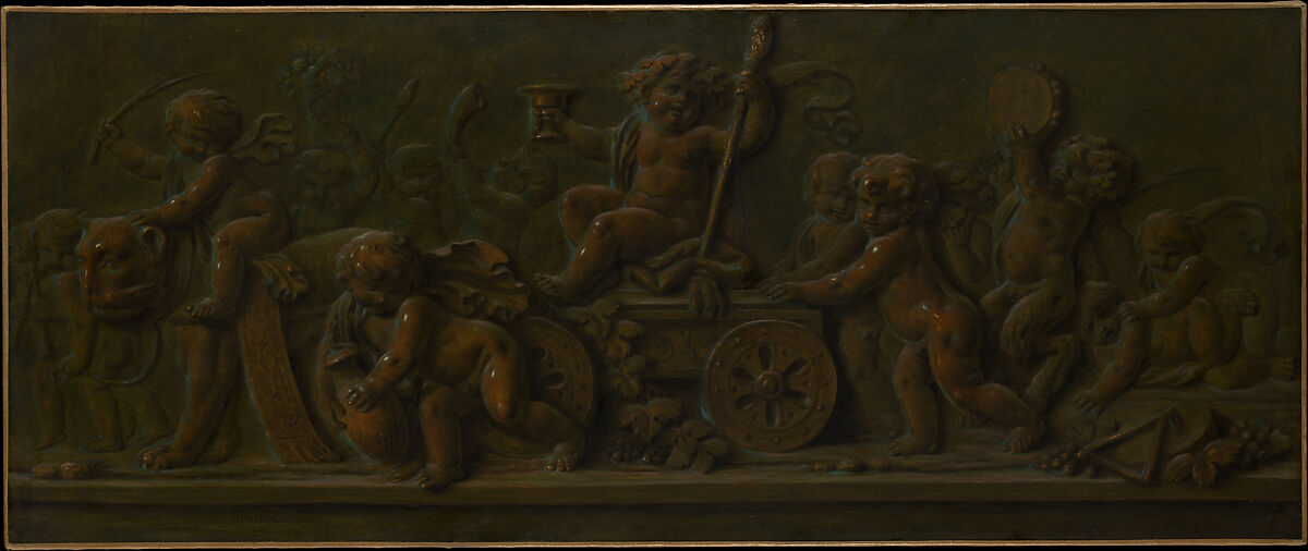 Sauvage’s name was synonymous with trompe l’oeil (fool the eye) paintings that imitated low relief ancient sculpture and became hugely popular for Neoclassical room decoration. The present painting is meant to imitate bronze. Sauvage exhibited a slightly larger version of this subject at the Salon of 1781. Another version is also at The Met.