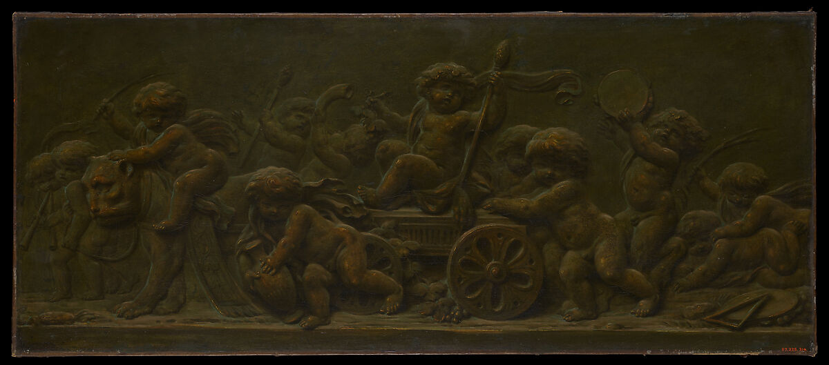 Sauvage’s name was synonymous with trompe l’oeil (fool the eye) paintings that imitated low relief ancient sculpture and became hugely popular for Neoclassical room decoration. The present painting is meant to imitate bronze. Sauvage exhibited a slightly larger version of this subject at the Salon of 1781. Another version is also at The Met.