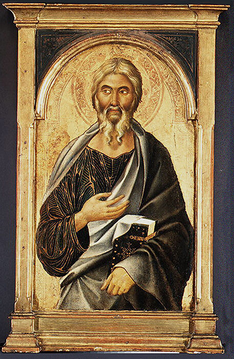 This is the best-preserved panel of a signed altarpiece by Segna of which three other panels are also in The Met. Although Segna’s art is dependent on the work of Duccio, his figures have a regal, hieratic formality. His ascetic, harshly featured saints consciously evoke a more archaic art, and he notably retained the Byzantine use of gold striations on draperies—emblematic of the sacred world of icons. For more information about this painting, including a reconstruction of the altarpiece, visit metmuseum.org.