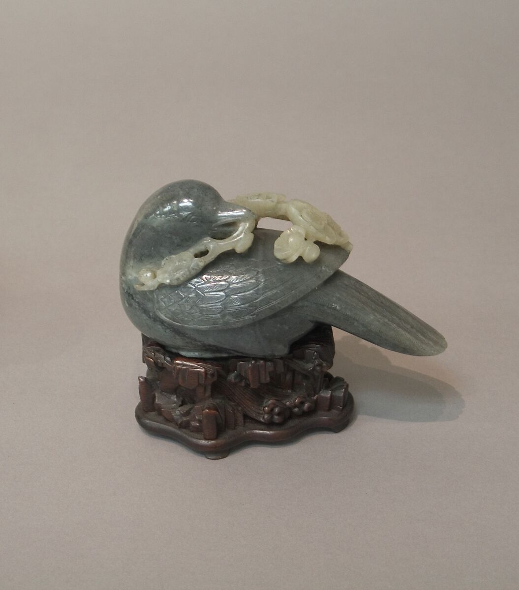- Medium: Nephrite, dark and light gray speckled and veined with black