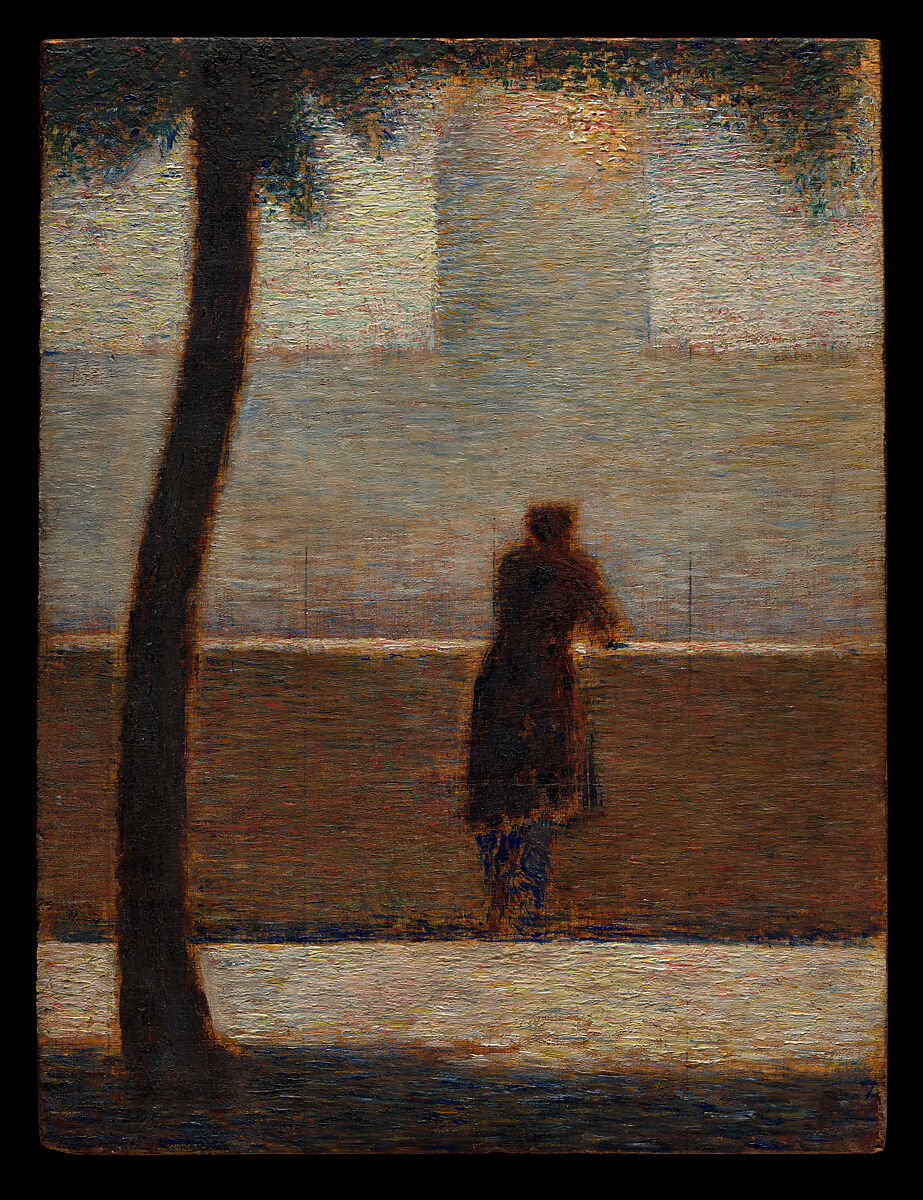 In the studio inventory made following Seurat’s death, this painting appears as "panel no. 1." One of the artist’s earliest works, it relates to pictures he made about 1880–81 that show single figures absorbed in thought or engaged in labor. The composition reveals his incipient talent for carefully calibrated light effects, bold silhouettes, and flat, geometric forms. Just visible through the leaves is the dome of the Institut de France, across the Seine from the Louvre in Paris.