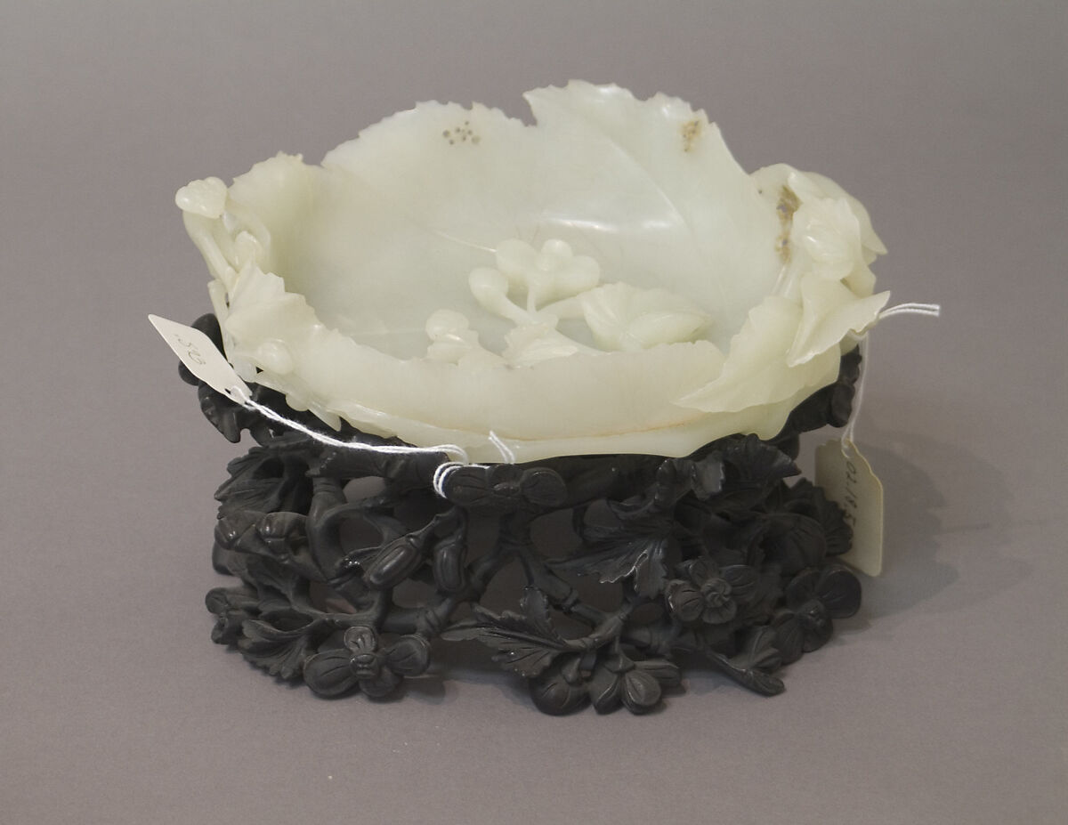 - Medium: Nephrite, white with very light greenish tint and spots of brown