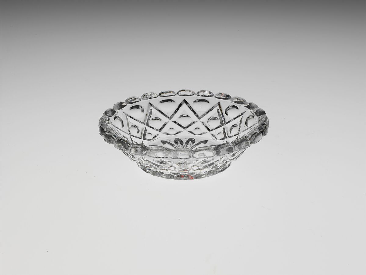 With the development of new formulas and techniques, glass-pressing technology had improved markedly by the late 1840s. By this time, pressed tablewares were being produced in large matching sets and innumerable forms. During the mid-1850s, colorless glass and simple geometric patterns dominated. Catering to the demand for moderately-priced dining wares, the glass industry in the United States expanded widely, and numerous factories supplied less expensive pressed glassware to the growing market. At the Exhibition of the Industry of All Nations at New York’s Crystal Palace in 1853, for example, the New England Glass Company exhibited 130 pieces of one design, "consisting of bowls, tumblers, champagnes, wines, and jelly glasses." This object belongs to one such service. Although the glass manufactory is not known, the glassware is very typical of the large services that were very popular with America’s middle class in the nineteenth century.