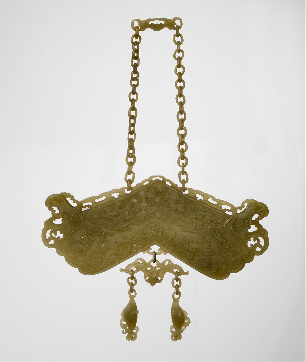 The association of bells and stone chimes with ancient ritual made them ideal subjects for reproduction as decorative objects. In the late eighteenth century, when the supply of jade was plentiful, archaistic bells and fanciful stone chimes were made from the precious material. The fashion for this type of jade object probably began in the imperial workshops during the Qianlong reign (1736–95) and continued in commercial enterprises through the nineteenth century.