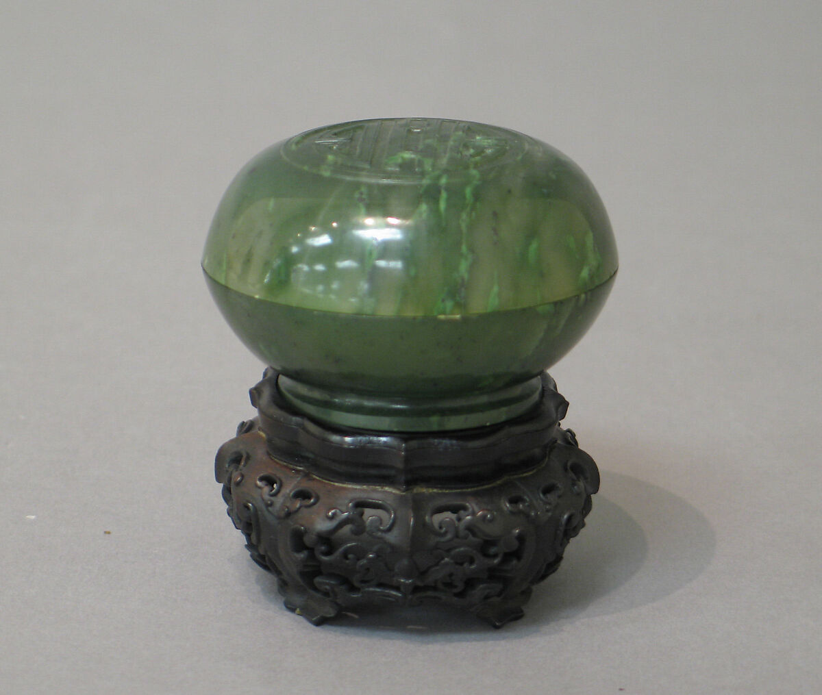 - Medium: Nephrite, dark olive-green, translucent, and mottled by lighter shades