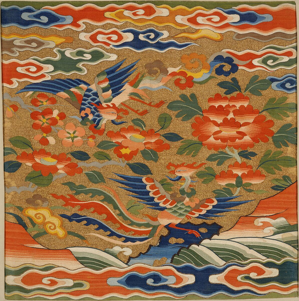 The phoenixes appear in a symbolic landscape of clouds, waves, and a decorative rock surrounded by colorful flora: (clockwise from lower left) auspicious fungus, camellia, prunus, and (dominating the right) tree peonies. Unpatterned edges at the top and bottom of the textile (now hidden under the mat) suggest it was woven for a special purpose, probably as a decorative rank insignia for a female member of the imperial household.