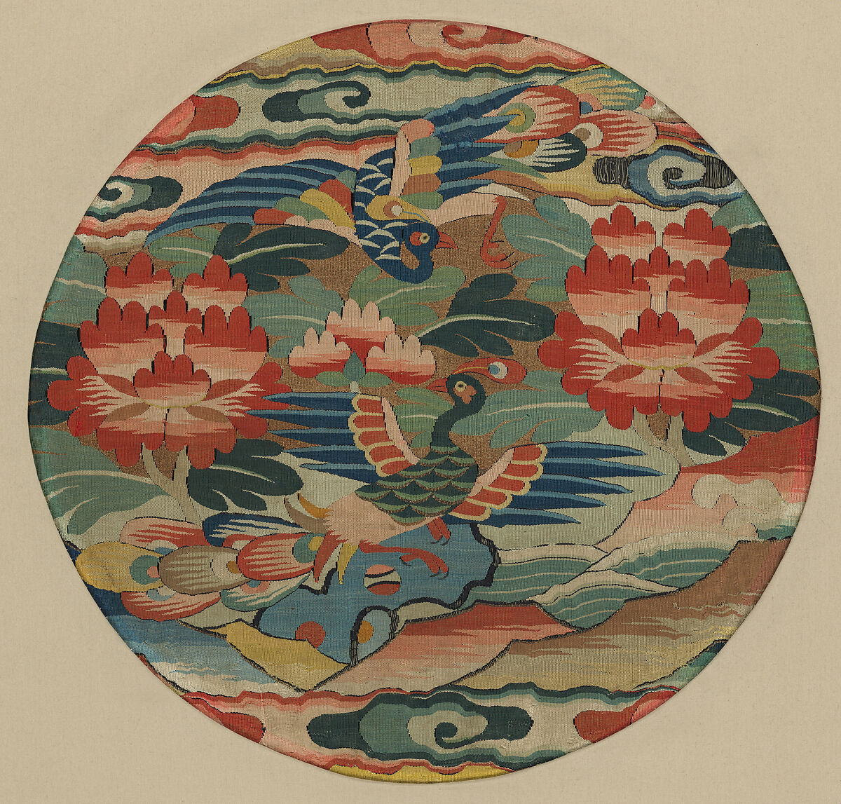 This medallion was a badge for a civil official of the third rank in the Ming dynasty. Originally square, it has been cut, perhaps to serve as the cover for a round box. Ming-dynasty rank badges were usually woven or embroidered as part of an official’s robe; later, in the Qing dynasty, separate badges were applied to their garments.
