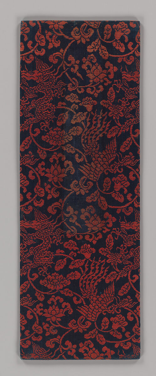 Sutras printed in the accordion-fold format were often encased by covers wrapped in decorative silks. Covers both protected the sacred words and presented the sutras in beautiful envelopes that signaled the importance of the contents within. These examples from the sixteenth century indicate the variety of sutra cover motifs, including some seemingly irrelevant to Buddhist philosophy, such as dragons, phoenixes, or the character shou, meaning longevity