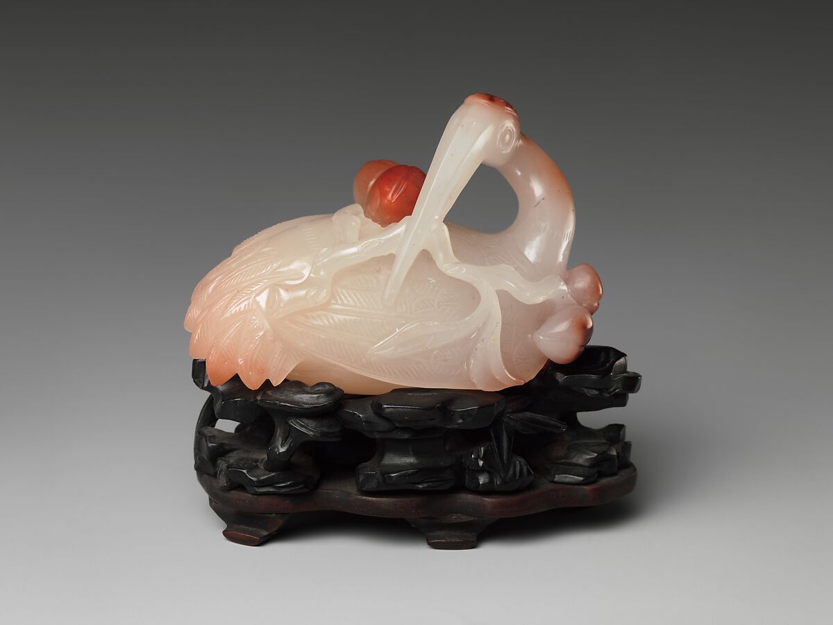 A crane holding a branch of peaches symbolizes longevity. The crane is believed to live for more than a thousand years and has been associated with immortals who would ride on its back. The peach is understood to have more potent life-extending power. In Chinese legend, the fruit grows on sacred trees in the garden of the Queen Mother of the West and ripens every three thousand years; a person who eats it will live forever.