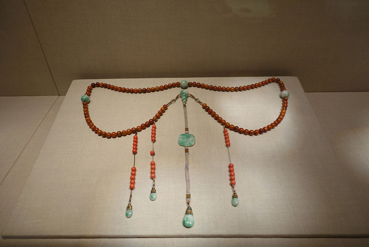 During the Qing dynasty, high-ranking civil and military officials wore necklaces of beads, which were standard uniform regalia. The beads were made of semiprecious stones and strung with silk ribbons. The rarity of the material and colors of the ribbons signified the ranks of the officials.
