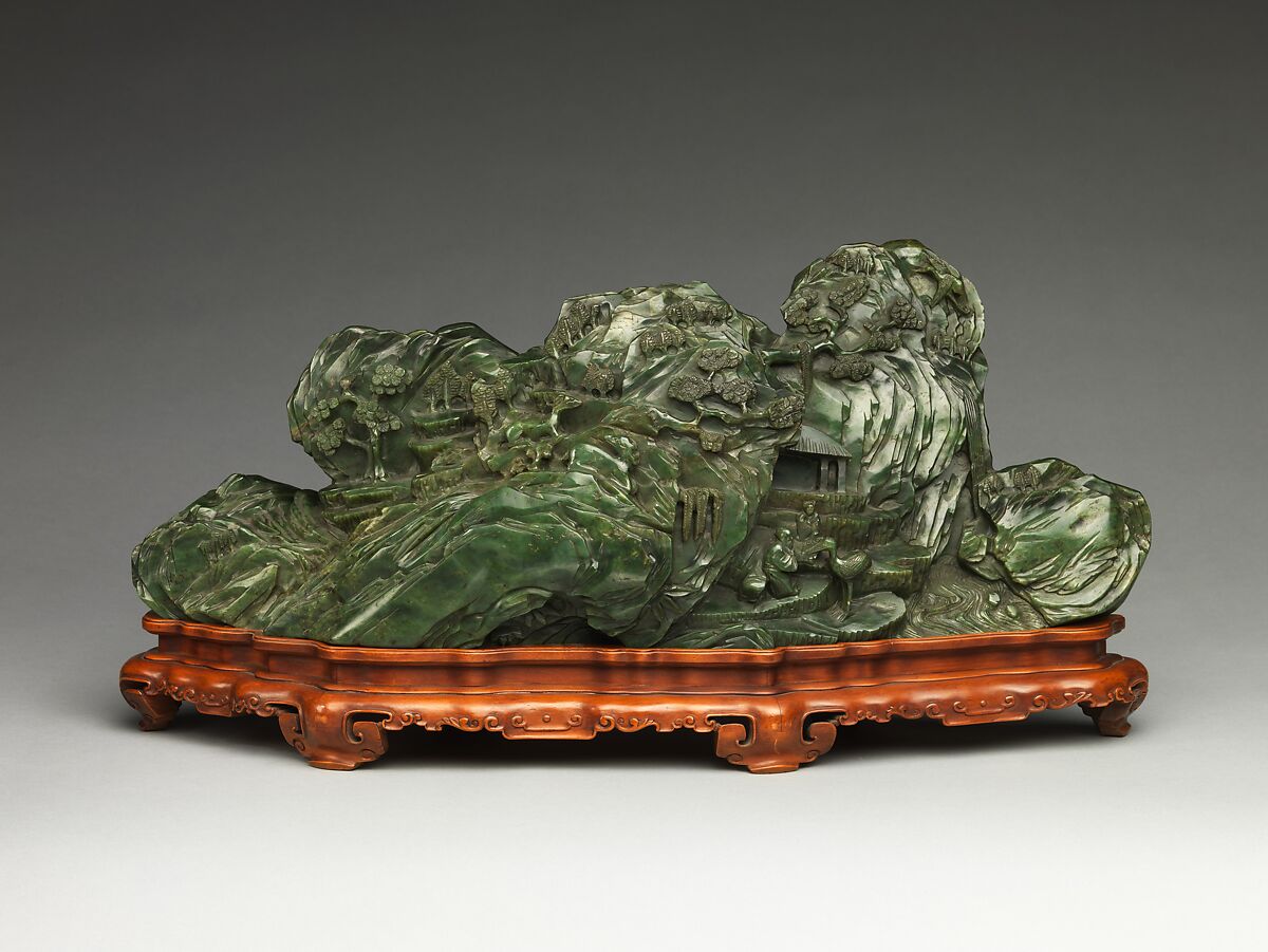 This sculpture exploits the otherworldly luminescence of jade to depict a landscape beyond the reach of mere mortals. In the foreground, by a rushing river, an aging scholar communes with a crane, the frequent companion of Daoists and hermit