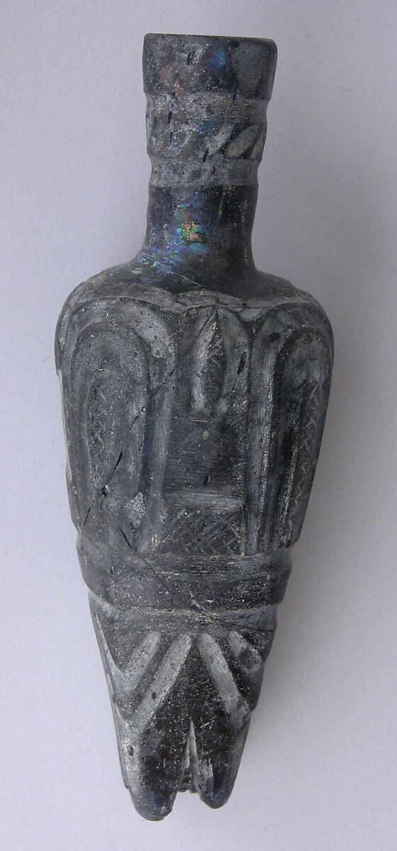 Among the numerous molar flasks -- named for their feet, which resemble the roots of molar teeth -- that have been discovered, this cobalt blue example stands out for its unusually large size. Molar flasks have been found in a variety of places, including Nishapur in Iran and Fustat in Egypt, indicating that they were probably produced or disseminated widely.