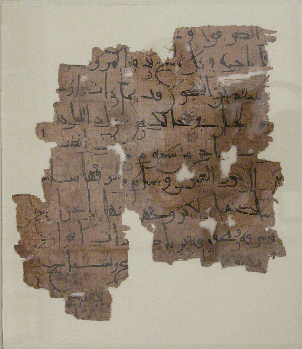 This papyrus fragment of a non-illustrated single work is written in a cursive script with rounded letter terminals. Although the side shown here has ten lines, the other side has only seven that are smaller in scale. Papyrus was used for documents, letters, and commercial transactions in a type of script that is comparable to the modern cursive style. Diacritical points and vowel marks are visible, however, suggesting that this fragment did not belong to one of these categories. In fact, the text, which describes demons (jins) as invisible beings of fire and dark as the blackness of night, is philosophical and theological in nature. This could be a record of a treatise like the Mishkat al-Anwar (Niche of Lights), by the great Muslim theologian al-Ghazali (1058–1111).