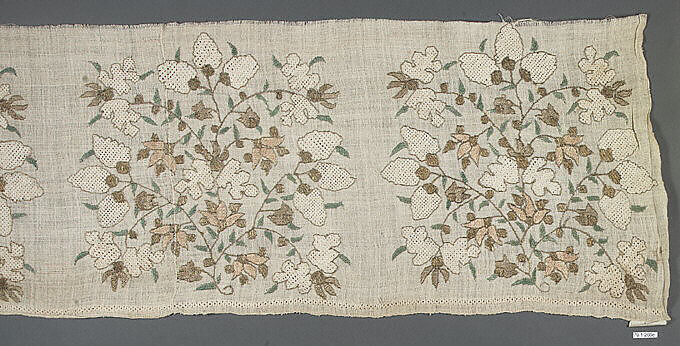 - Medium: Linen, silk, metal wrapped thread; plain weave, embroidered