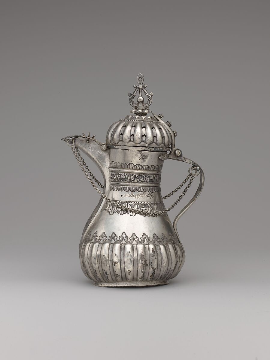 This coffee pot is typical of the objects that were displayed in open niches in reception rooms of upper-class Syrian residences during the Ottoman period.