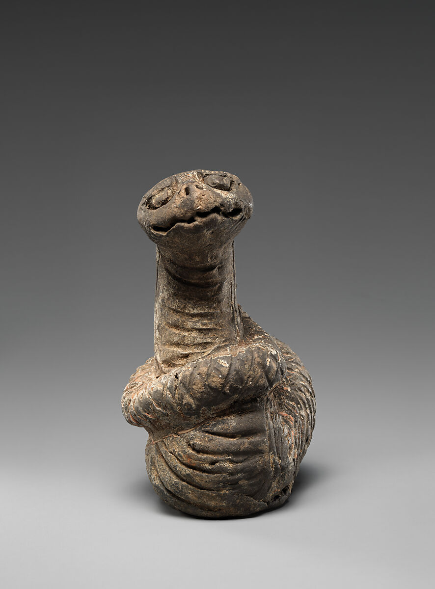 By the late Jin and Yuan dynasties, the twelve animals of the zodiac were scarcely included in burials. They were often depicted with exaggerated physical features; their heads are disproportionately large and their expressions are playful and mischievous, like cartoon figures. The snake, for example, smirks and rolls its bulging eyes as it raises its head above its coiled body.