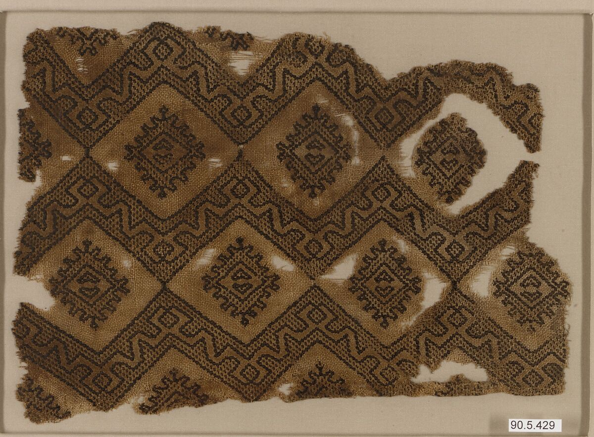 This fragment consists of undyed linen weave with brocade in black silk. The pattern is of zigzag bands that create diamonds around them, into which a diamond-shaped form is inserted. Apart from the thick, distinctive black outlines, black silk is also used to create a dotted ground in the bands and the diamond-shaped form. The regularity of the repeating pattern suggests that the original fabric may have been a larger piece, perhaps a bolt of textile.