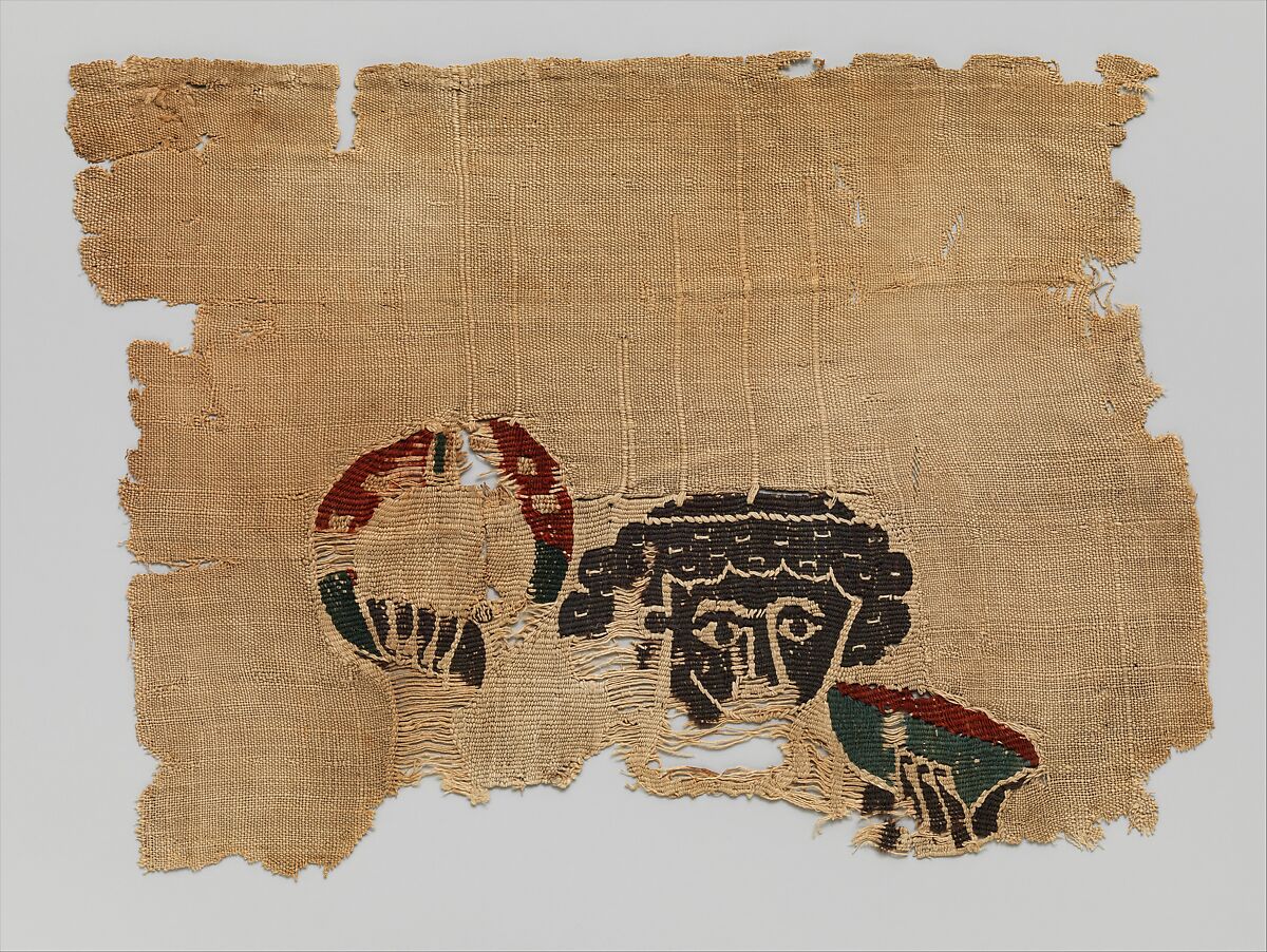 A wonderfully expressive face is all that remains of the figure holding in one hand a phiale, a shallow bowl designed for pouring liquid offerings. In the other hand is a wreath or tambourine. Similar figures are frequently encountered in textiles of the early Byzantine period, generally as part of a raucous procession celebrating the god Dionysos.