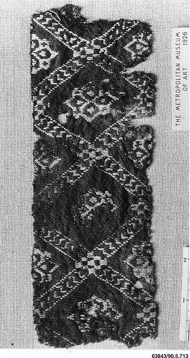 • Medium: Wool, linen; plain weave, brocaded (?)