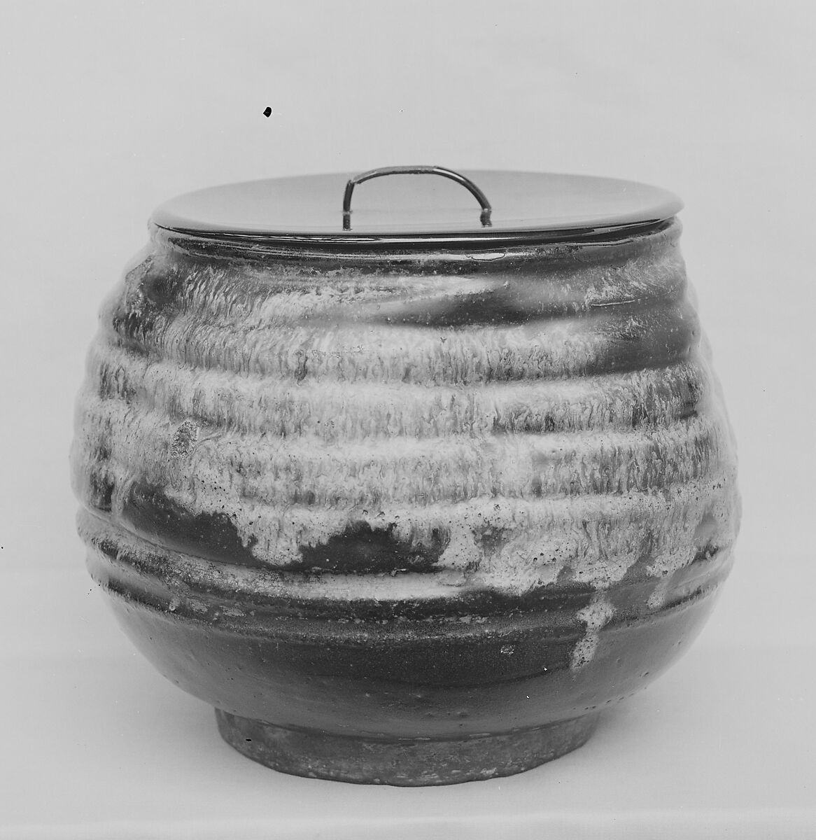 - Medium: Clay covered with a black glaze and a white frothy overglaze; lacquer cover (Karatsu ware)