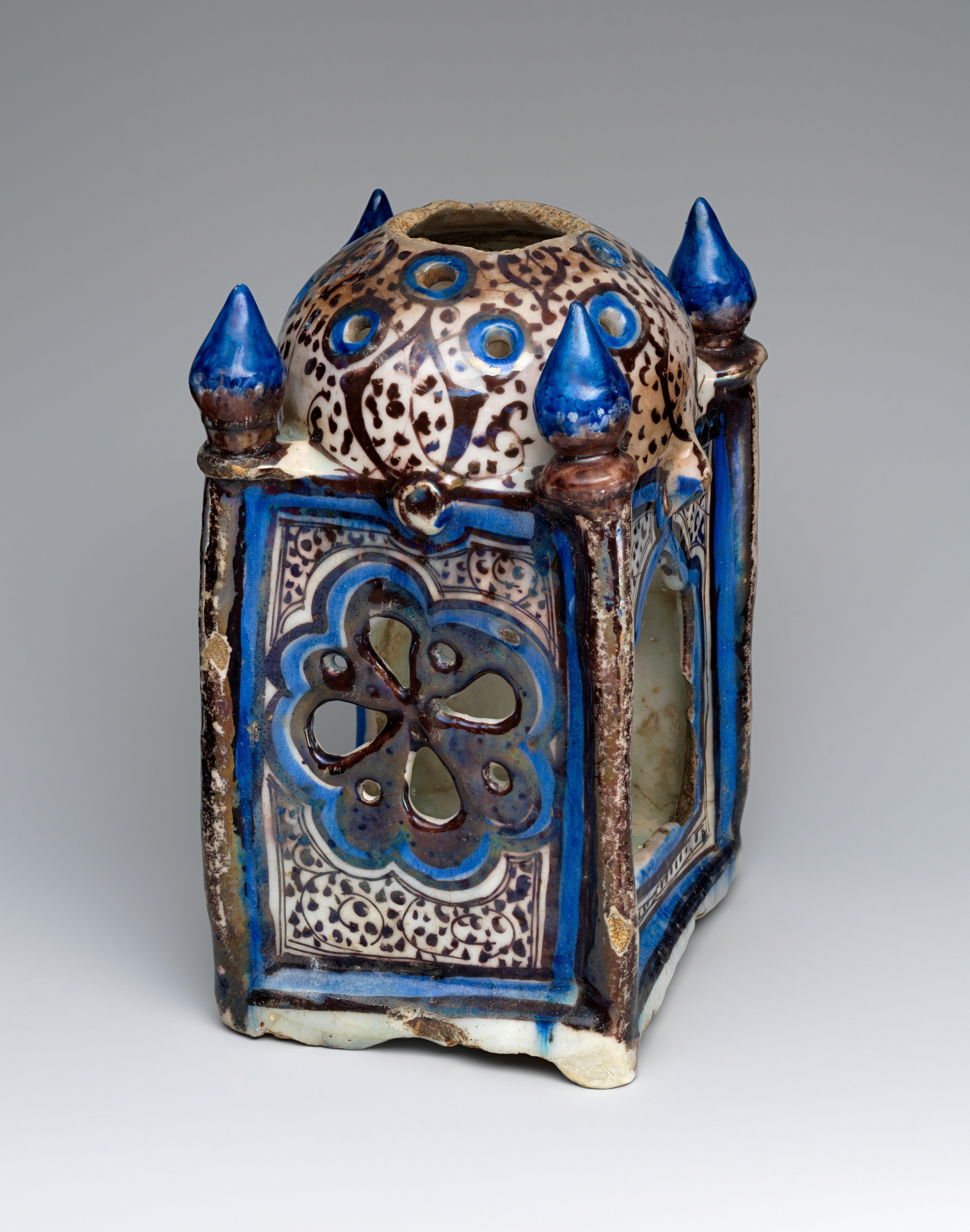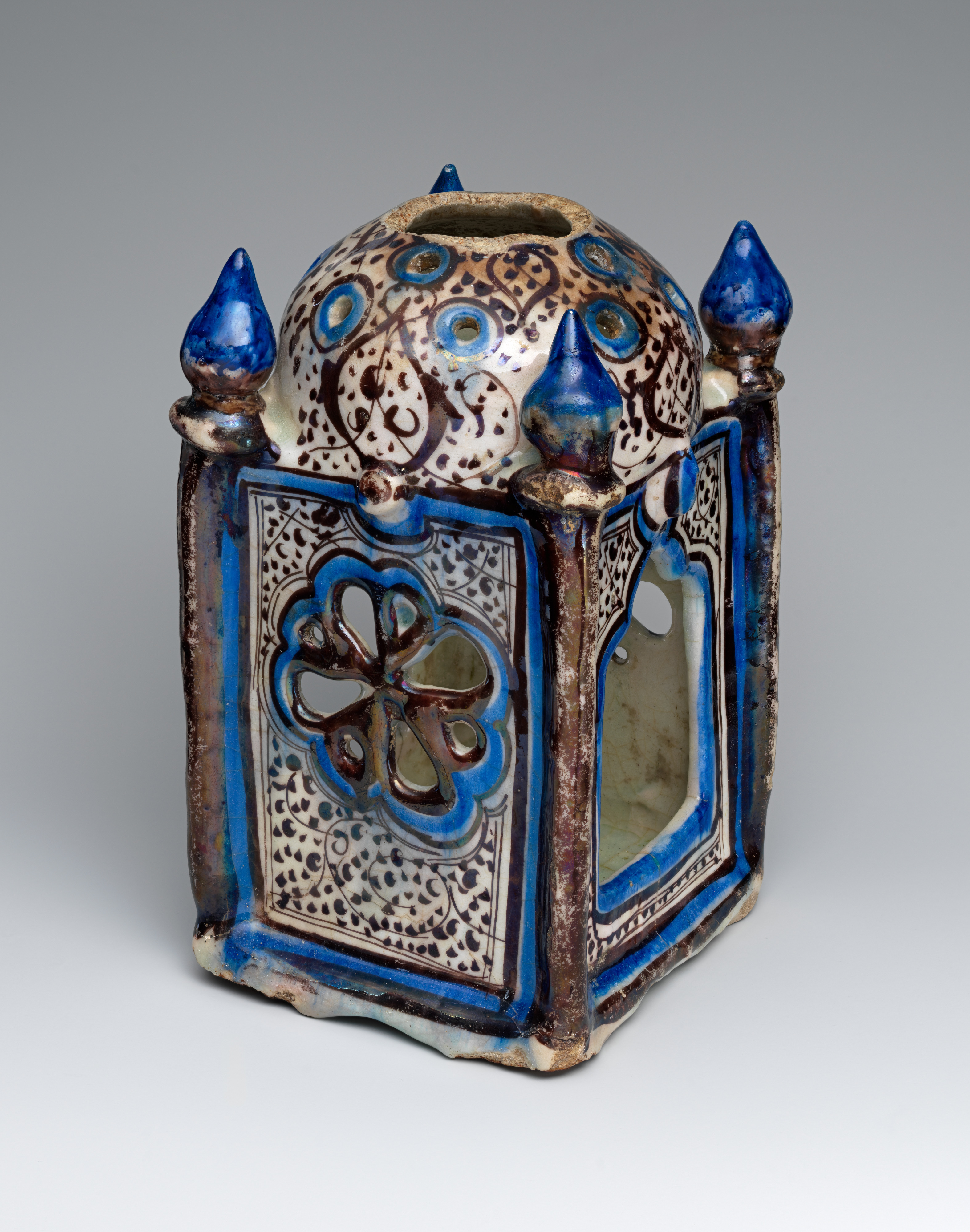The decoration of the lantern highlights its architectonic elements. A sketchy vegetal scroll with dots, executed in brown luster against a white ground, meanders across the dome and the walls. The columns are painted entirely in luster, which is now rather abraded. Concentric outlines of blue and luster paint accentuate the piercings of the dome as well as the four rectangular wall panels and their openings. Surmounting the arches is interlace ornament that mimics a decorative device frequently found in Syrian buildings of the Ayyubid and Mamluk periods.