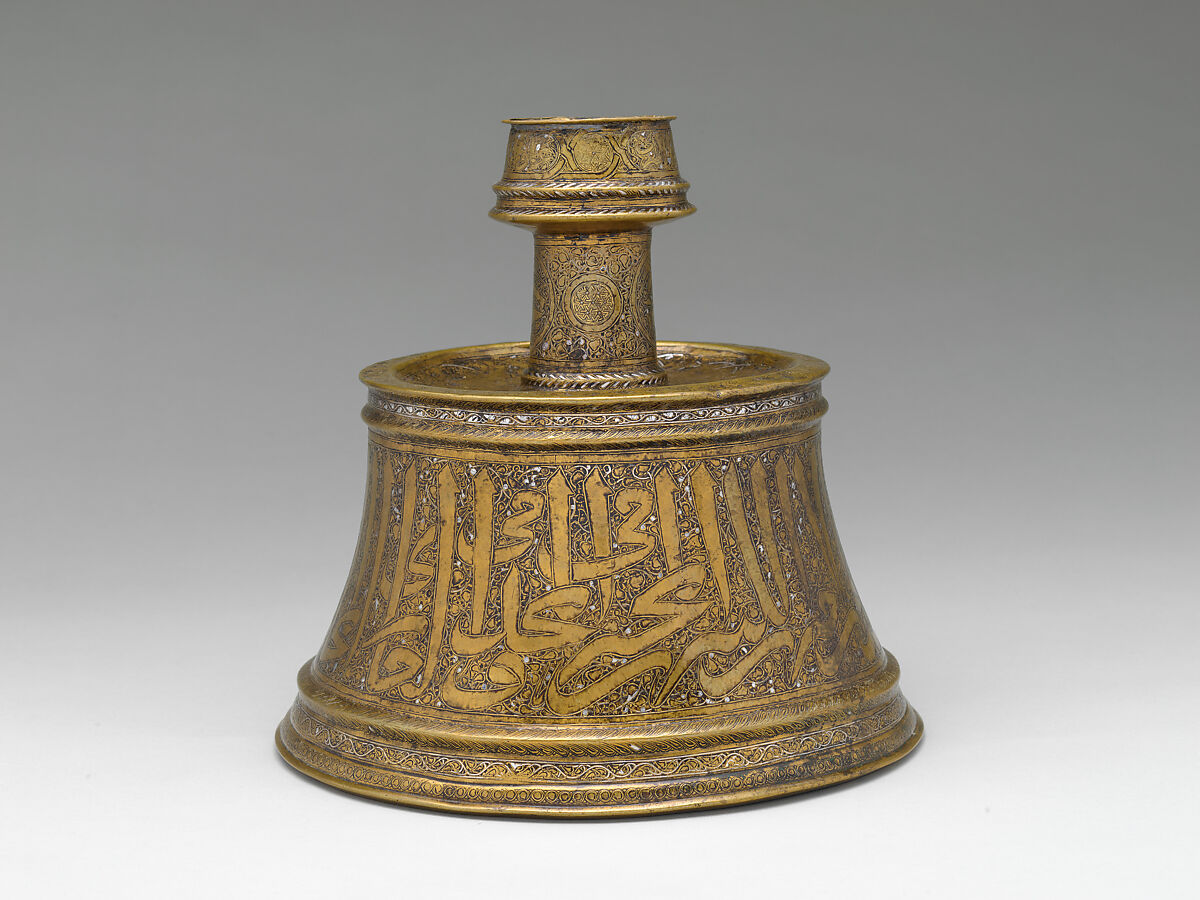 Candlesticks in the shape of a truncated cone surmounted by a cylindrical shaft and a socket to accomodate a candle often flanked the mihrab in religious buildings. The same type was also used as house furnishing. The elegant inscription around the body is dedicated to an anonymous emir of the Mamluk court.