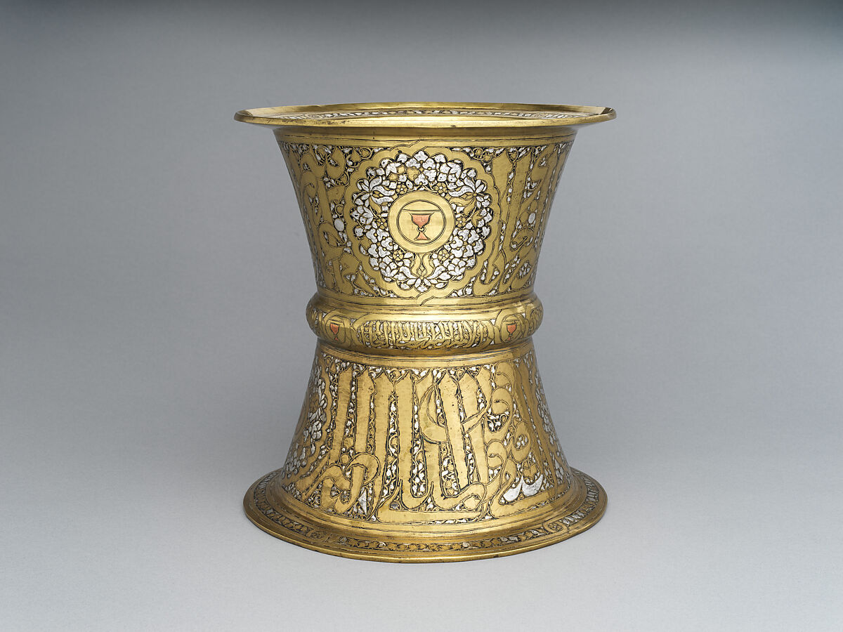 - Medium: Brass; hammered, turned, and chased, inlaid with silver, copper, and black compound