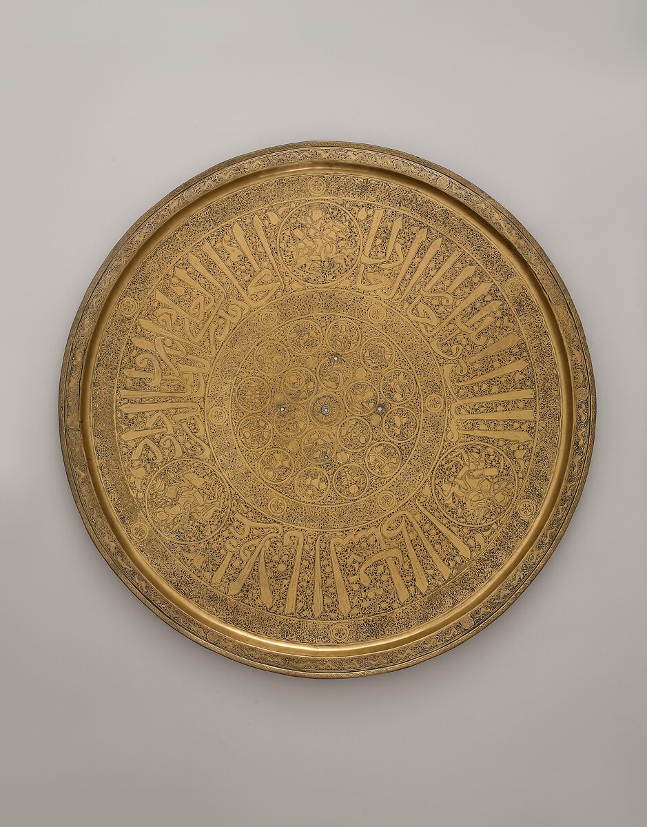 This tray has concentric bands of decoration around a central Sun disk. Included in the bands are personifications of the six planets and the twelve signs of the Zodiac, coursing animals, and an inscription (the titles of a Mamluk official) with medallions containing a falconer, polo players, and seated musicians.