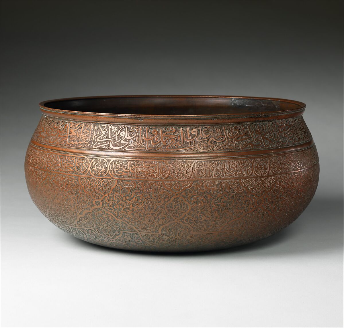 The defining elements of this bowl—cloud scrolls, cartouches, interlacing roundels, and the "Y" pattern—point to Safavid Tabriz as the most likely place of production. Immediately below the rim is a Shi'i prayer in naskh script. Enclosed in the cartouches are verses invoking abundance and happiness. The name of the owner, Qasim ibn Husain Qannadi, the artist’s signature, and the date of manufacture appear further down, in the row of quatrefoils. The bowl can also be linked to the late fifteenth‑century Turkmen school of metalwork, which had close stylistic ties to the arts of the Ottoman and Mamluk empires.