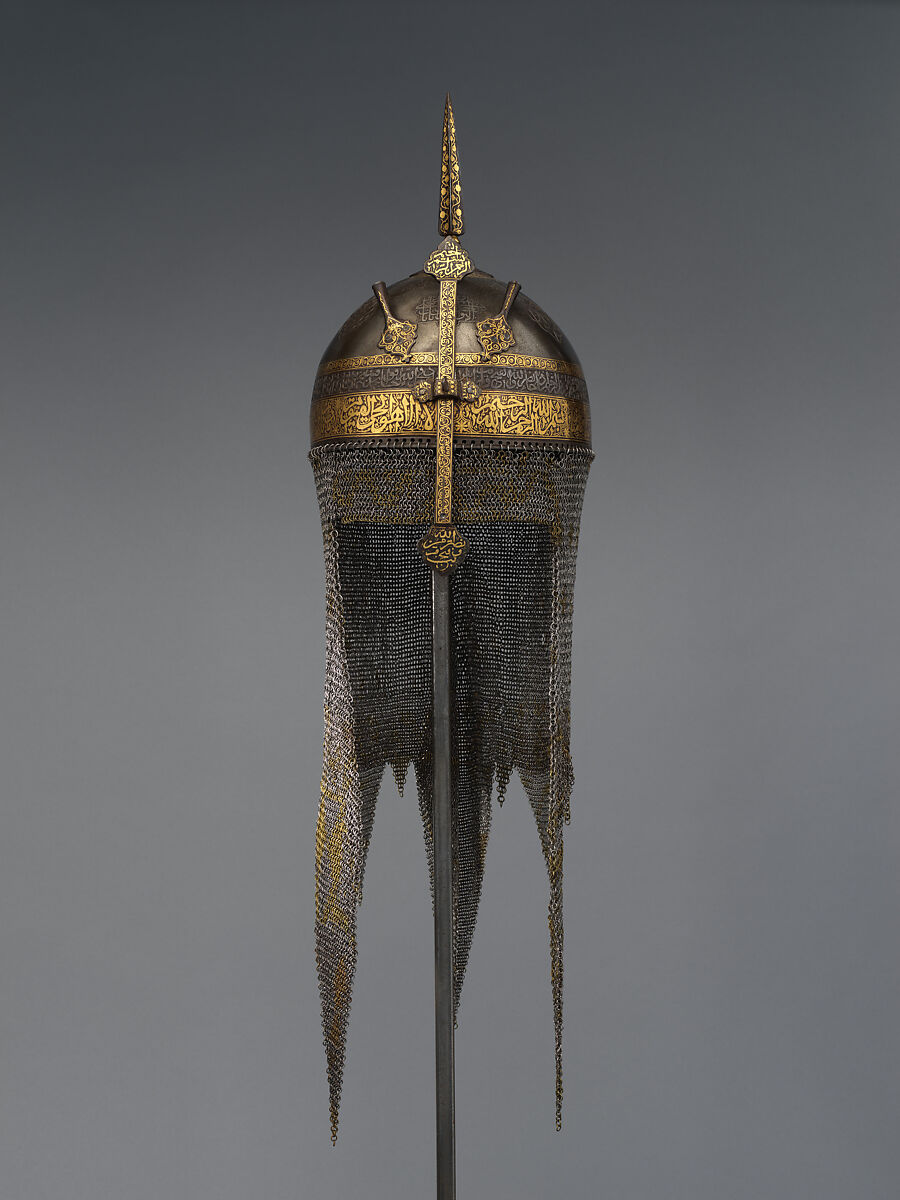 Although this helmet was a serviceable military object, it was probably used as an accessory of a parade armour. Forged from watered steel and damascened in gold with talismanic inscriptions, it contains an invocation to 'Ali, the son-in-law and cousin of the Prophet, and calls upon him for protection against harm and danger. The verses are distinctly Shi'i, and commonly found on objects from the Timurid through the Qajar periods in Iran and Central Asia.