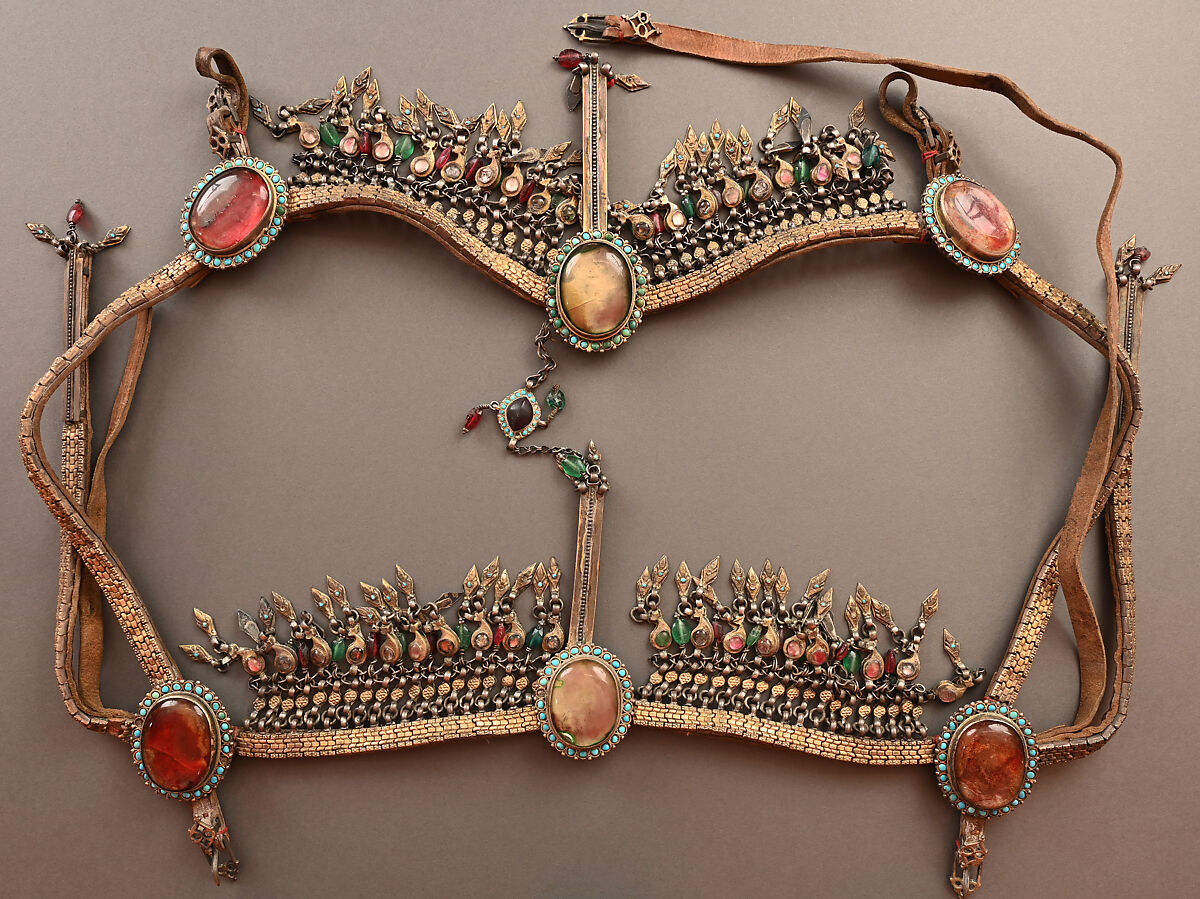 Historically, horses have been critical to life in Central Asia. Equine ornaments like this headstall were considered an extension of the dress of the rider. This exquisite example has a vibrant, polychrome appearance that would have richly adorned a horse for a ceremonial occasion.