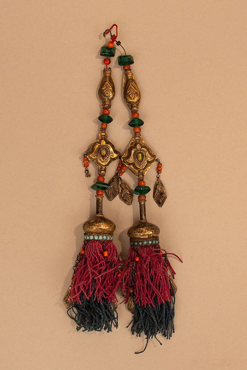 Among the many beautiful adornments worn by Uzbek women were jewels to adorn their hair. This ornament would have attached to a woman’s plait, or braid and embellished her long tresses. A variety of materials make up this object including silk, gilt-silver pendants, coral, turquoise, and pieces of green glass. These individual components were not all locally sourced and illustrate the strategic location of Uzbekistan along the silk road. The regions of Bukhara, Khiva, Samarkand, and Kokand were important centers for the trade of jewels, textiles, and other luxury goods.