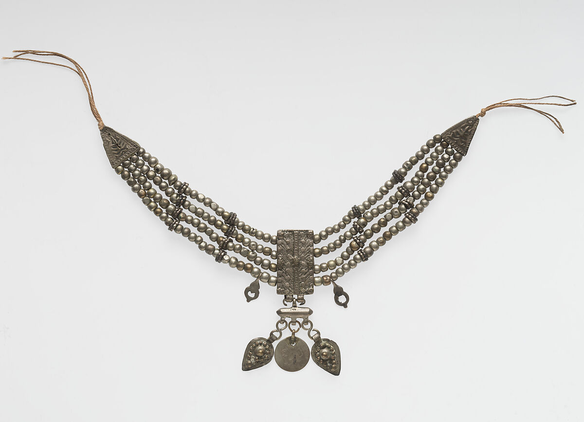 Yemen’s location at the southern tip of the Arabian Peninsula made it an important site for the trade of goods from the Indian subcontinent and East Africa, as well as the rest of the Islamic world. Yemeni jewelry often displays foreign influence, as can be seen in this multi-strand necklace with triangular-shaped terminals—a form that is typical of India. The central pendant is in the form of an Ottoman coin, and references the occupation of Yemen by the Ottomans at various points in the early modern period.
