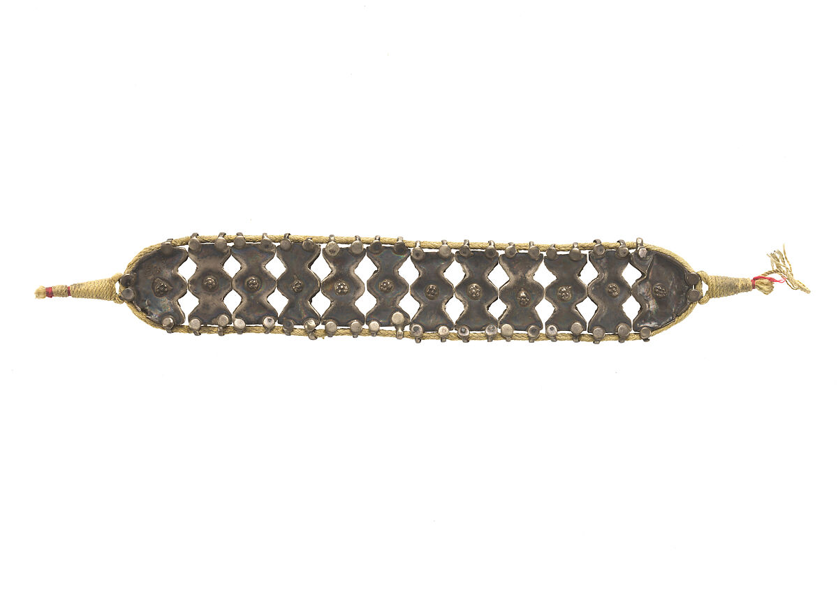 Jewelry in India was not restricted to wealthy members of society, but rather produced with varying materials to appeal to a range of economic classes. This armlet, or bazuband, has been made with a dark metal alloy embellished with beige-colored threads, and would have been owned by someone of modest means. Such jewels were worn on the upper bicep, adorning the arm of the wearer.