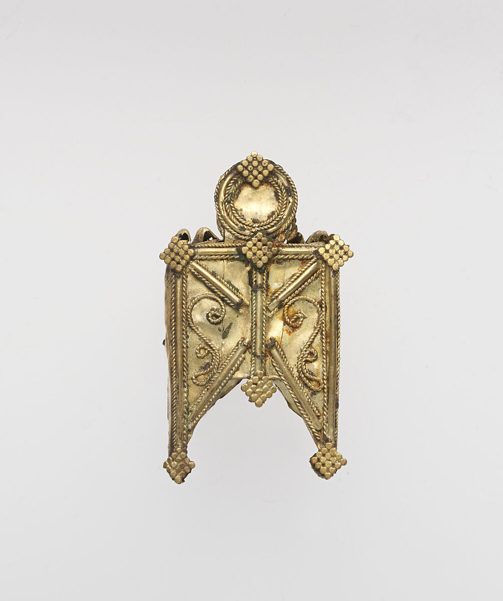 Pendants such as these are known to be worn at weddings in South India on necklaces of glass beads or silk. The form is apotropaic and phallic, ensuring protection and fertility of the bride. The use of gold is particularly important as this material is considered to be sacred in Hinduism.