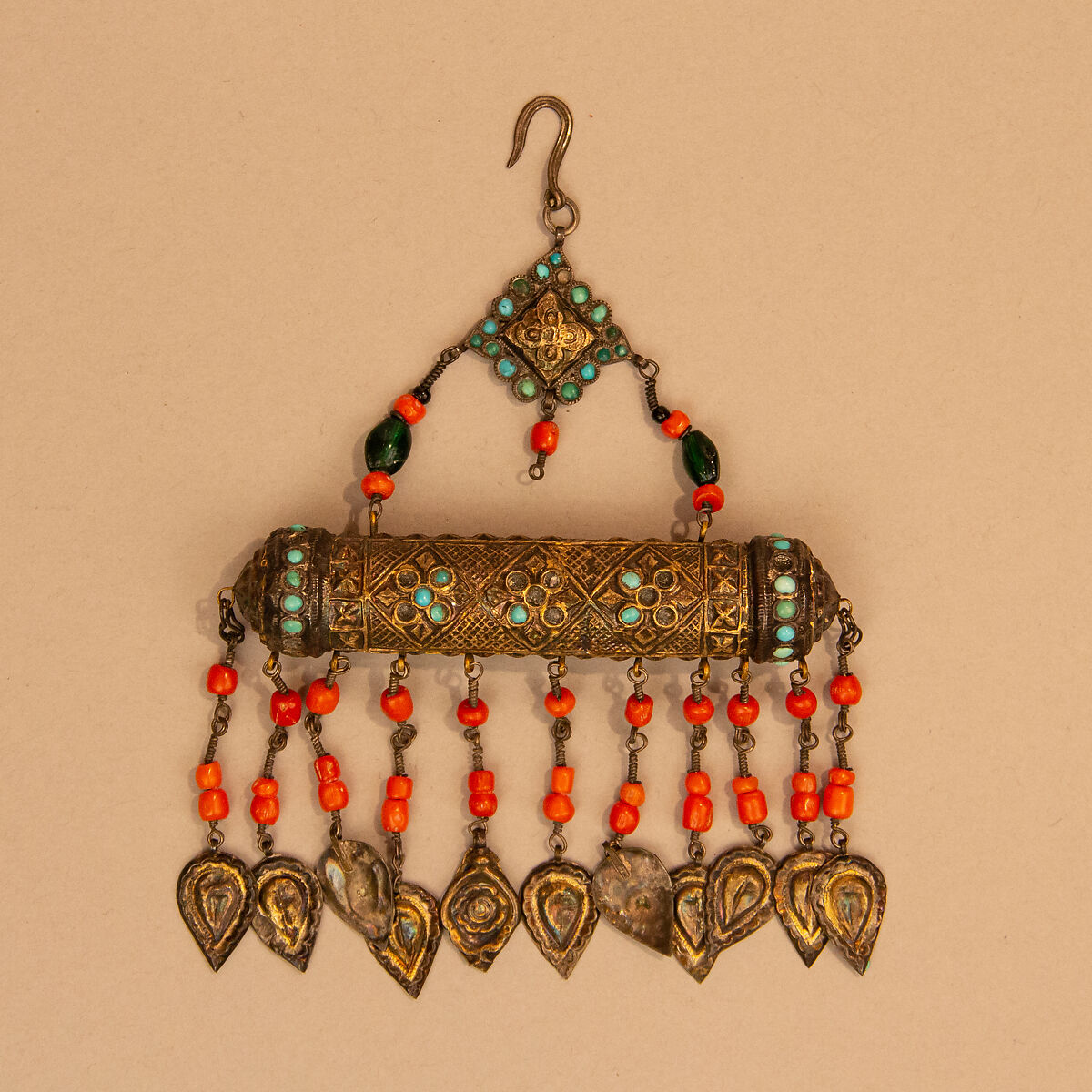 This ornament, one of a pair with 91.1.1145, takes the form of an amulet holder, a design that was intended to hold furled pieces of paper inscribed with verses of the Qur’an or other holy words. Such amulets were worn on the body to protect the wearer. This pair is studded with turquoise, coral, and glass beads and would have been pinned on each side of the wearer’s chest.
