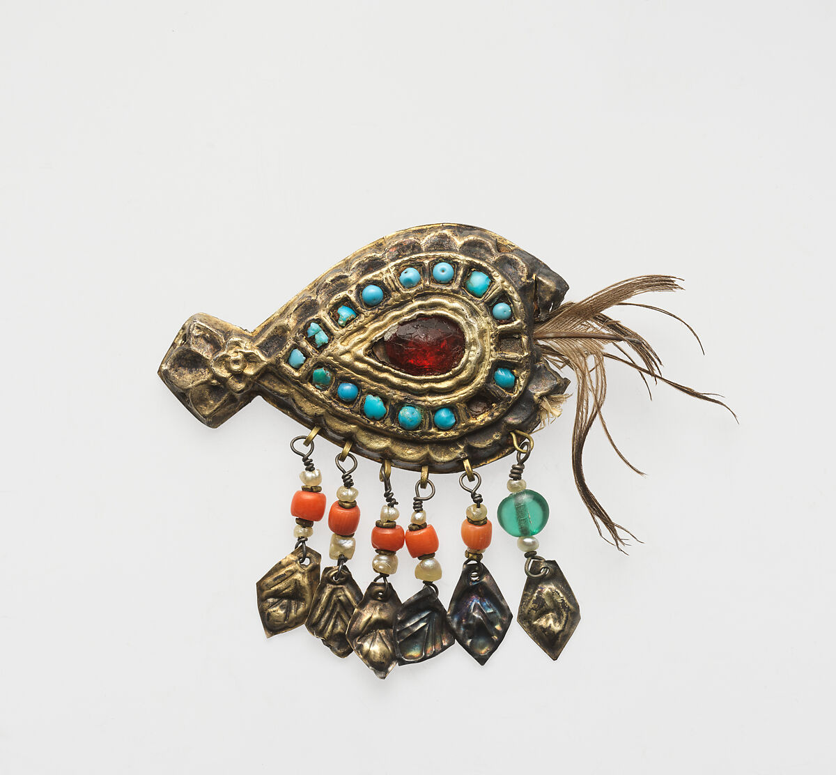 - Medium: Gold, turquoise, carnelian, feather