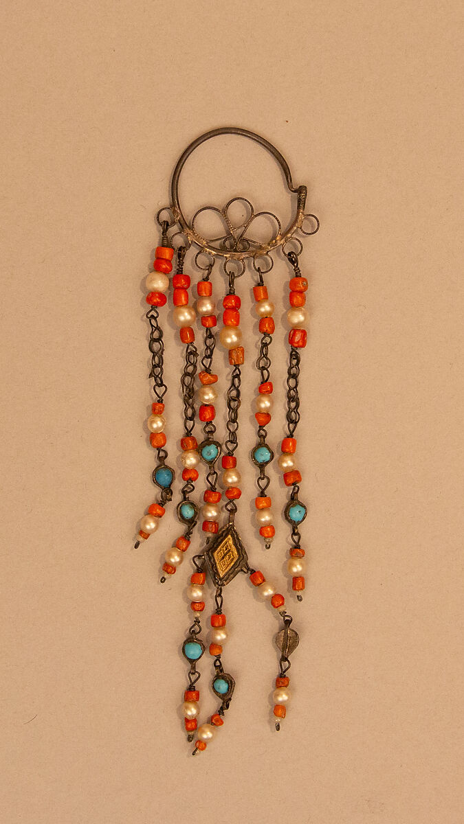 These beautiful pendant earrings were worn as part of an ensemble of jewels, including necklaces, head and hair ornaments, bracelets and rings. The variety of gemstones in these jewels illustrate the plethora of goods available in Bukhara, an important site located along the silk road. Coral may have been sourced from as far as the Mediterranean Sea, China, or India. Seed pearls would have been fished from the region of the Persian Gulf. Here, beads of glass are used in place of precious gemstones, giving a vibrant, polychrome finish to these jewels.