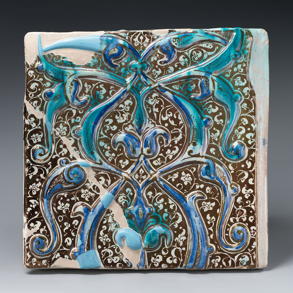 - Medium: Stonepaste; overglaze luster-painted, molded