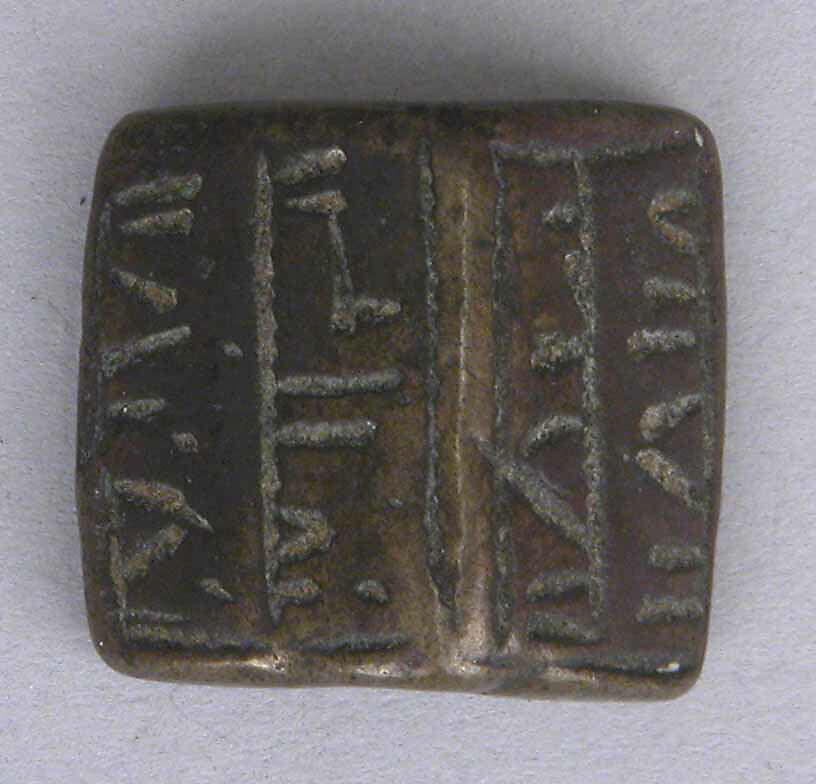 This gable-shaped object is perforated, suggesting that it was used as a bead, either as part of a piece of jewelry, or sewn on clothing. The incised signs on the top surface mimic Arabic script and are interpreted as a form of magic writing, used on a variety of objects of the 10th-14th centuries. It is, therefore, possible to postulate that this bead was worn on the body for protective and auspicious purposes.