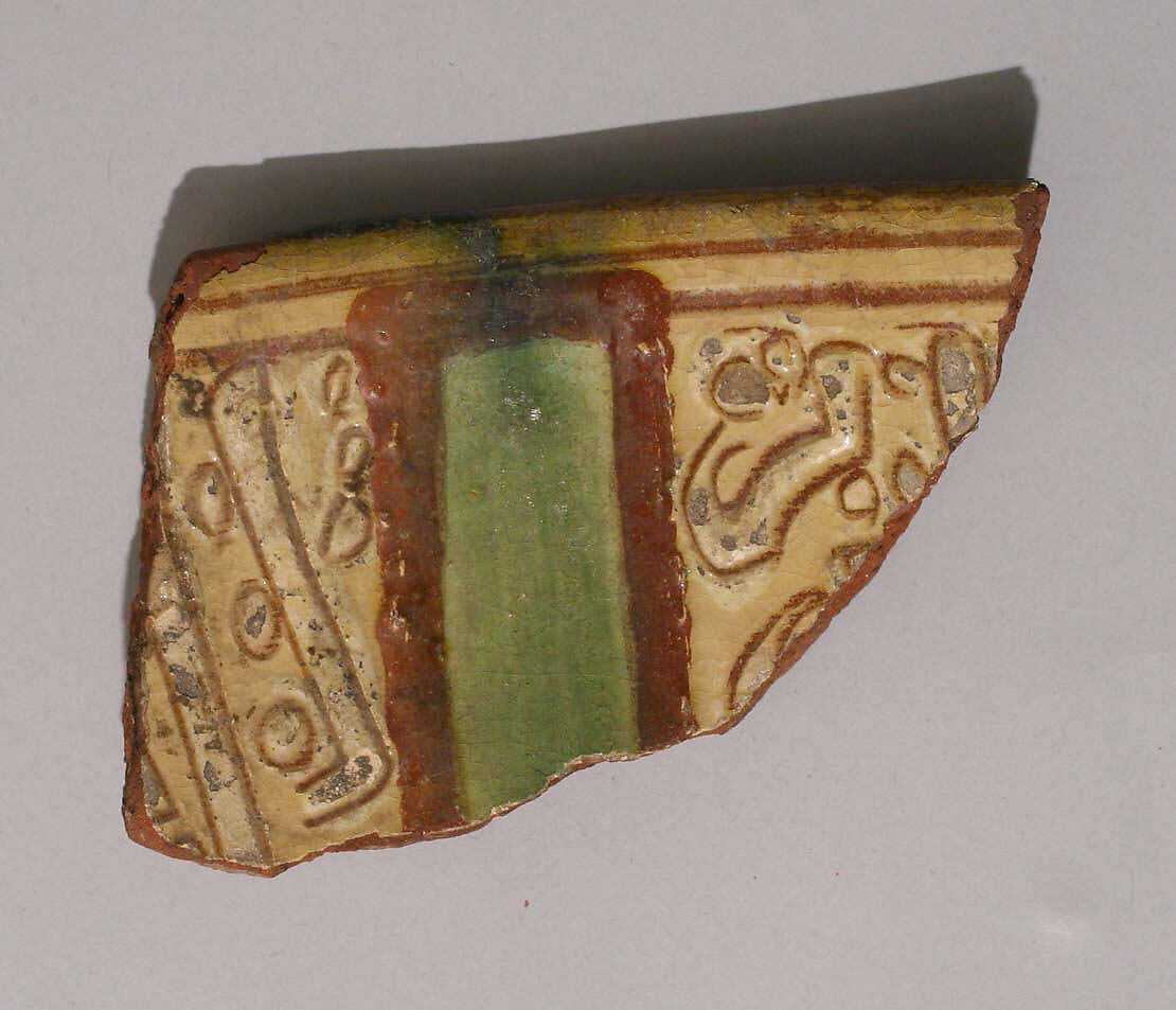 - Medium: Earthenware; incised decoration through a white slip and coloring under transparent glaze