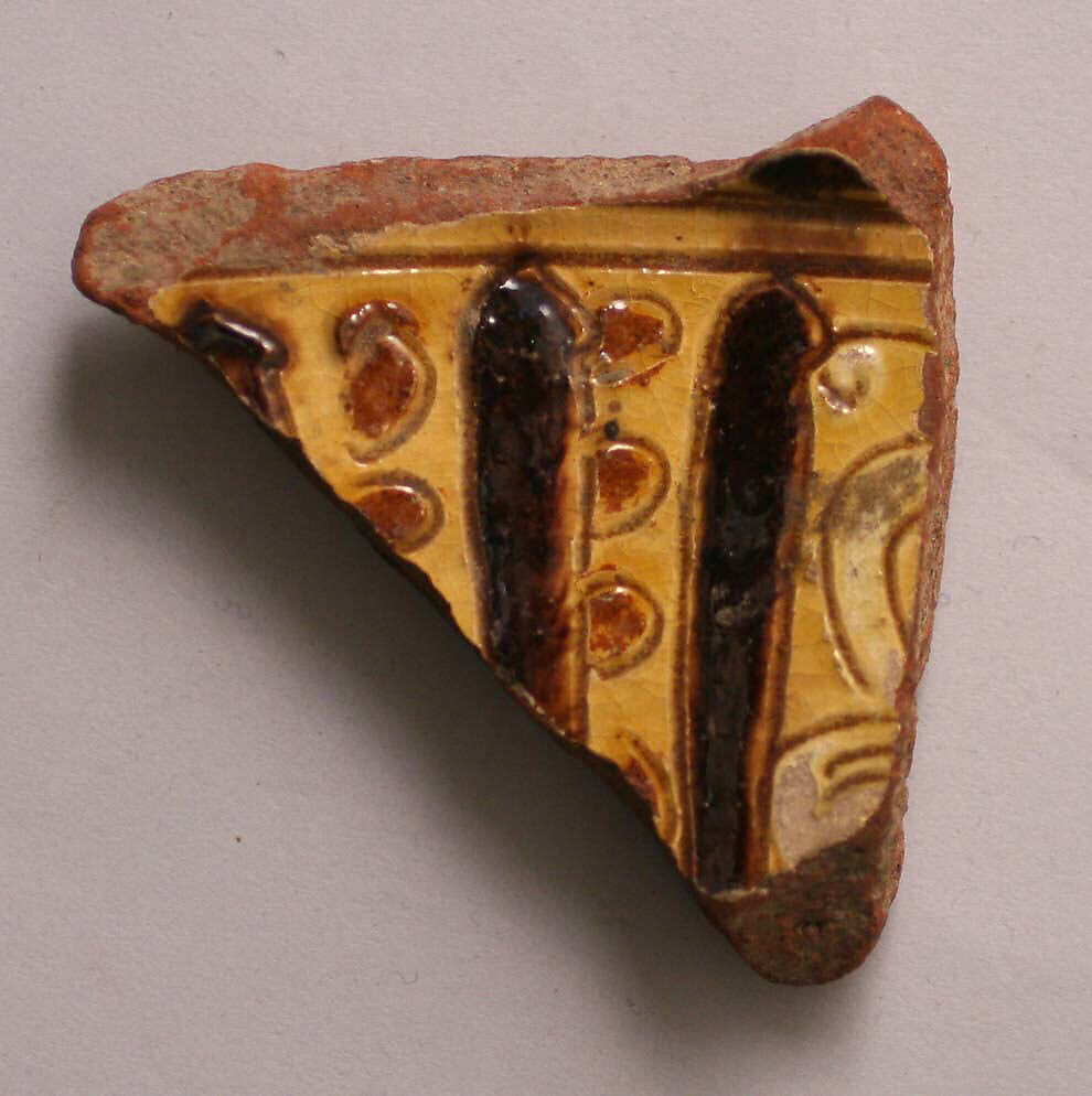 - Medium: Earthenware; incised decoration through a white slip and coloring under transparent glaze.