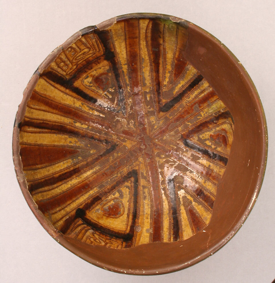 - Medium: Earthenware; incised decoration through a white slip and coloring under transparent glaze