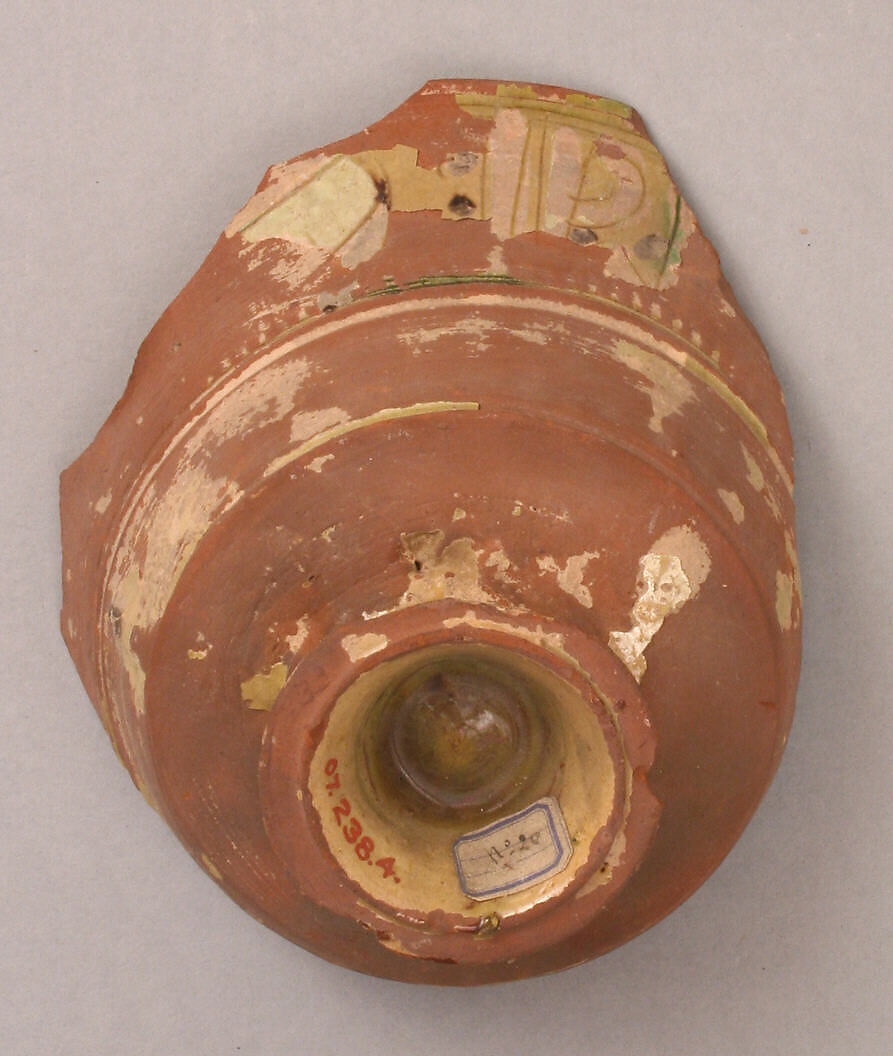 - Medium: Earthenware; incised decoration through a white slip and coloring under transparent glaze