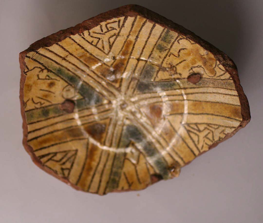 • Medium: Earthenware; incised decoration through a white slip and coloring under transparent glaze