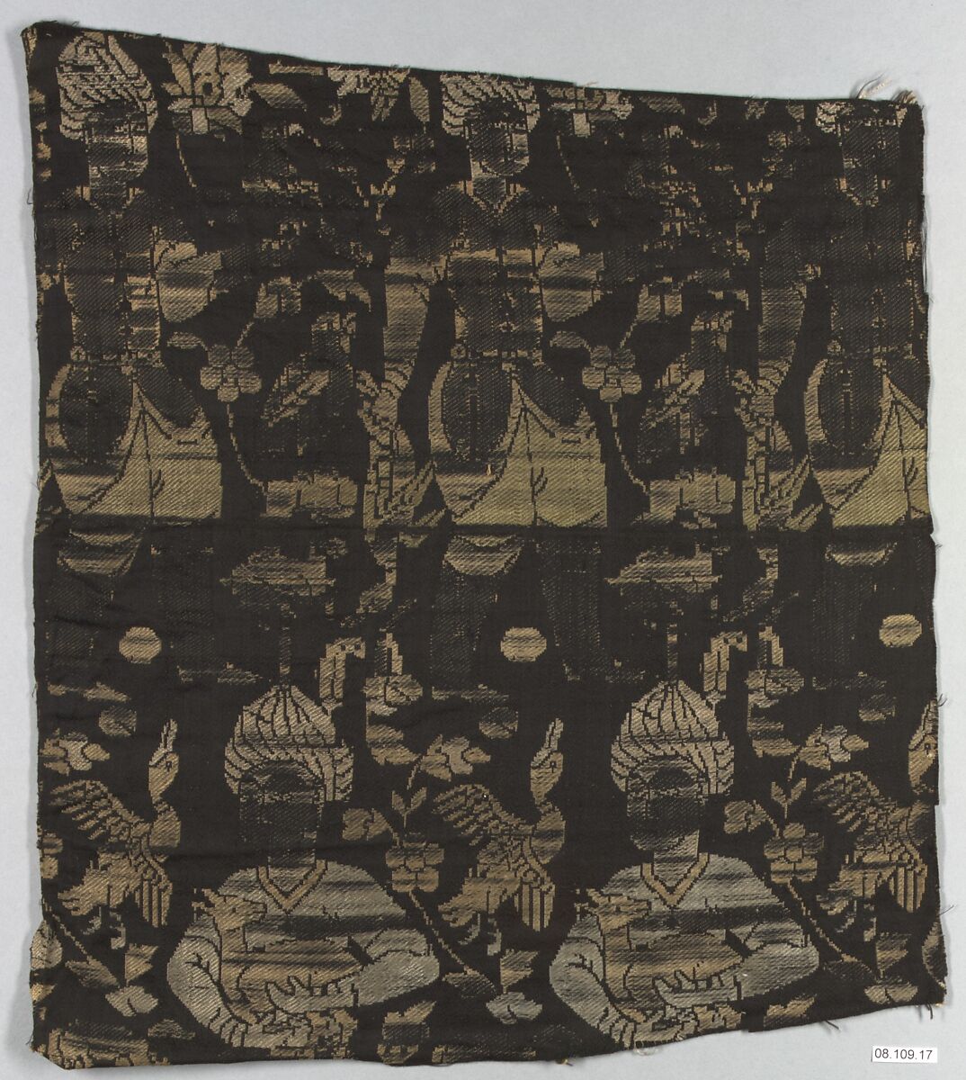This silk lampas fragment is decorated with a repeating design of turbaned figures carrying animals. Men in the top row, accompanied by falcons perched on their left arms, hold dead ducks by their tails, while the figures below cradle gazelles in both arms. In the full textile, these rows would have continued to alternate, forming a staggered repeating pattern completed by the partridges, flying ducks, and flowered vines that fill the gaps between figures. The figural decoration of this garment or home furnishing provides a glimpse into the hunting practices and fashions of Safavid Iran.