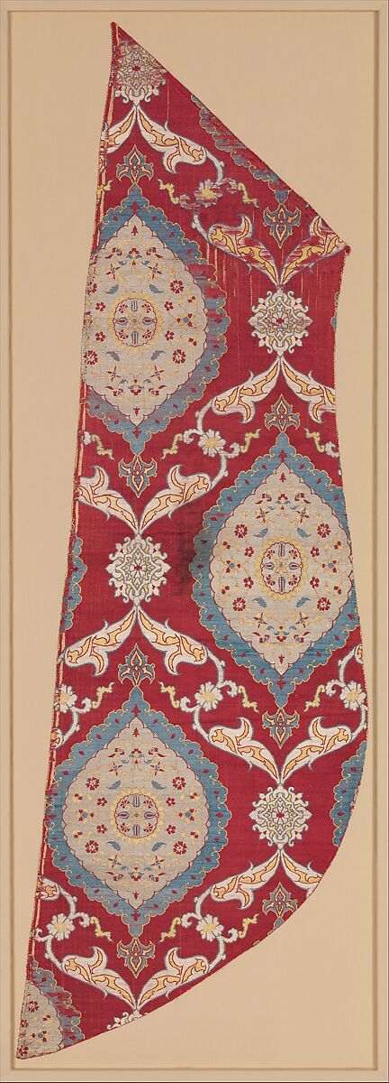 The ogival lattice pattern seen in this silk was one of the most popular designs for textiles in the Ottoman court. Popular in both China and Mamluk Egypt, the ogival design made its way into the Ottoman visual repertoire, where it was combined with the floral style favored by the imperial court. The tall, narrow, irregular shape of this silk textile suggests it was cut for use as a sleeve of a robe or other garment.