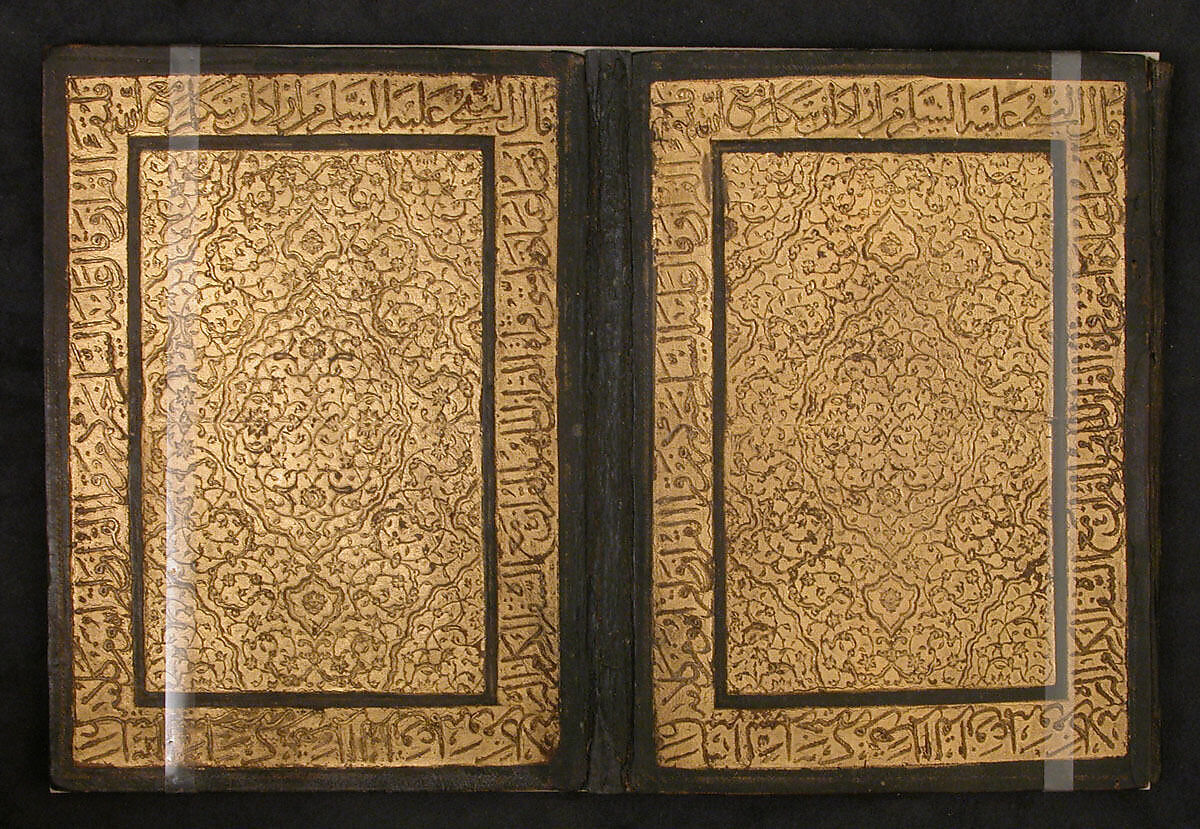 This elaborate book-cover, with its medallions containing elegant and complex floral ornaments, was certainly intended to protect a high quality manuscript. The Arabic inscription that runs around the plates' borders clearly indicates that this cover was meant for a copy of the Qur'an: it mentions words traditionally attributed to the prophet Muhammad, including the phrase "He who wants to speak with God should read the Qur'an."