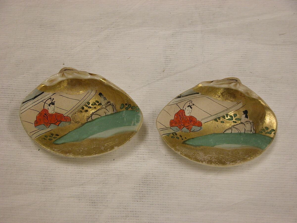 The shell game was a popular pastime in the Edo period. Sets like this one were often included in a daimyo bride's trousseau. To play the game, a number of shells are divided between two boxes. One group is taken out and then matched one at a time to the halves from the second box. Pairs of related scenes from the Tale of Genji and other romances are painted on the inside of the shells as clues.