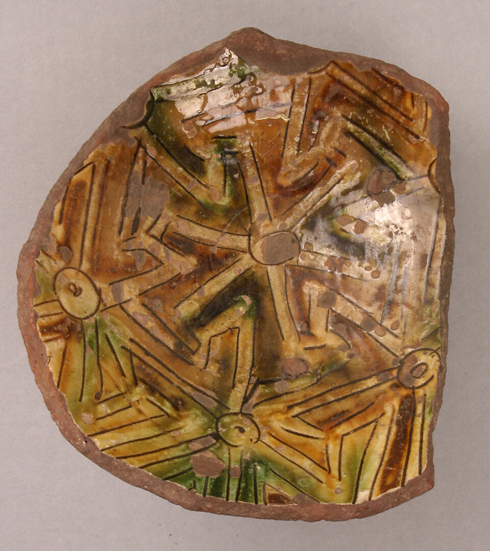 - Medium: reddish earthenware; white slip; green and rust underglaze; transparent glaze